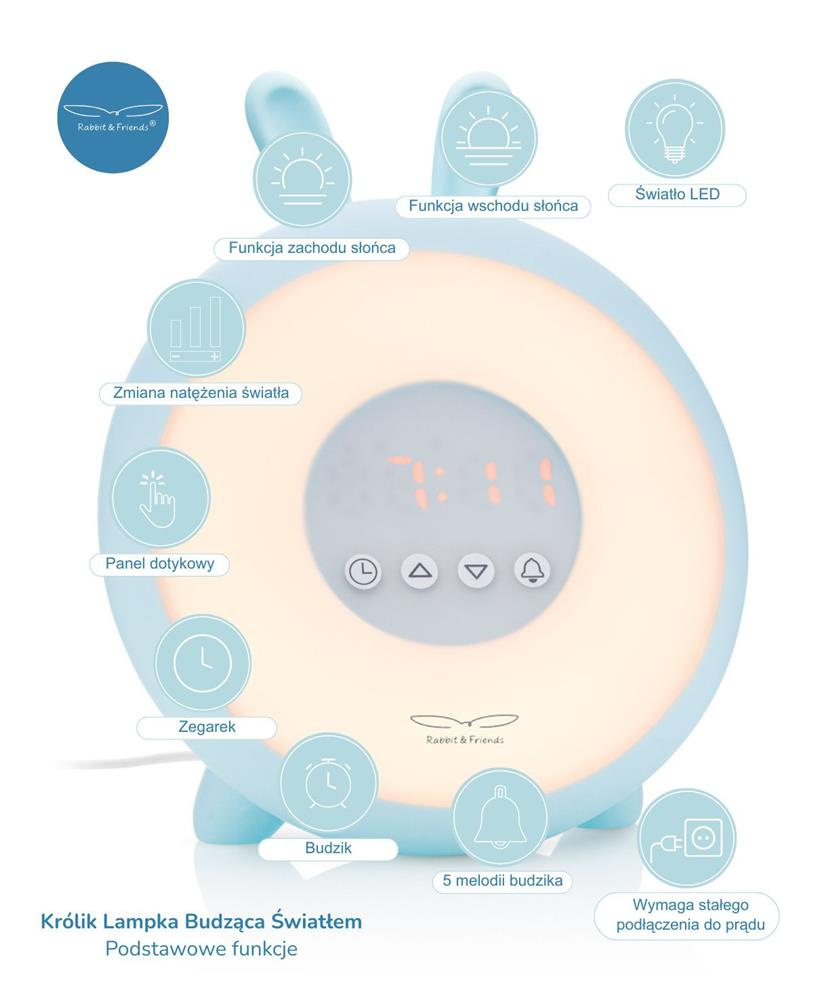 Najważniejsze zalety Lampki budzącej światłem 3w1 niebieski Królik Rabbit & Friends AC-W Lampki nocne dla dzieci: