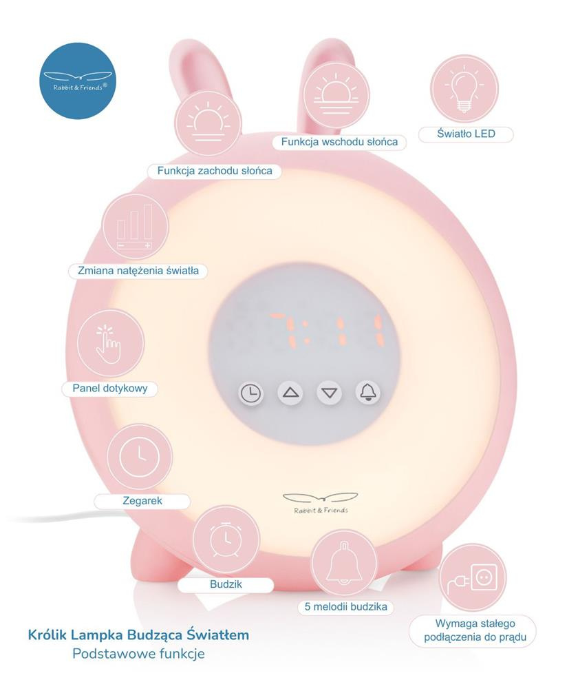 Najważniejsze zalety Lampki budzącej światłem 3w1 różowy Królik Rabbit & Friends AC-W Lampki nocne dla dzieci: