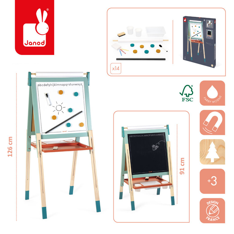 Najważniejsze zalety Dużej tablicy dla dzieci z regulowaną wysokością i 14 akcesoriami Janod J09625:
