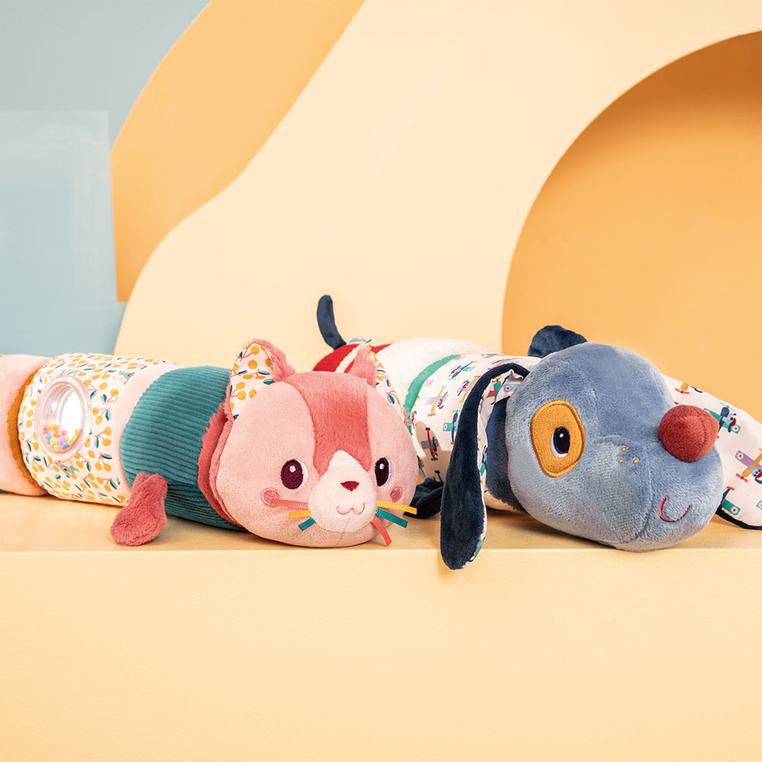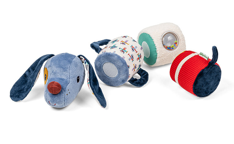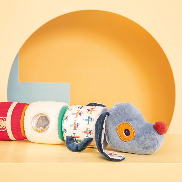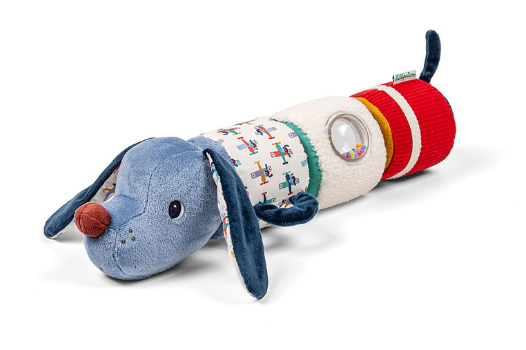 4 poręczne elementy, wykonane z tkanin o różnych fakturach i wzorach, kryją w sobie zaskakujące funkcje: w głowie pieska ukryta została grzechotka, jedna z części szeleszcząc, przyciąga uwagę dotykiem, kolejna zachwyca miękkim lusterkiem i kolorowymi kuleczkami, a ostatnia delikatnie dzwoni przy potrząsaniu. Długie uszy, puchaty nosek i sterczący ogonek w formie uchwytu wzbogacają zabawkę o dodatkowe bodźce, stymulując dziecięce zmysły.