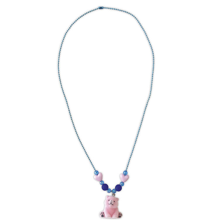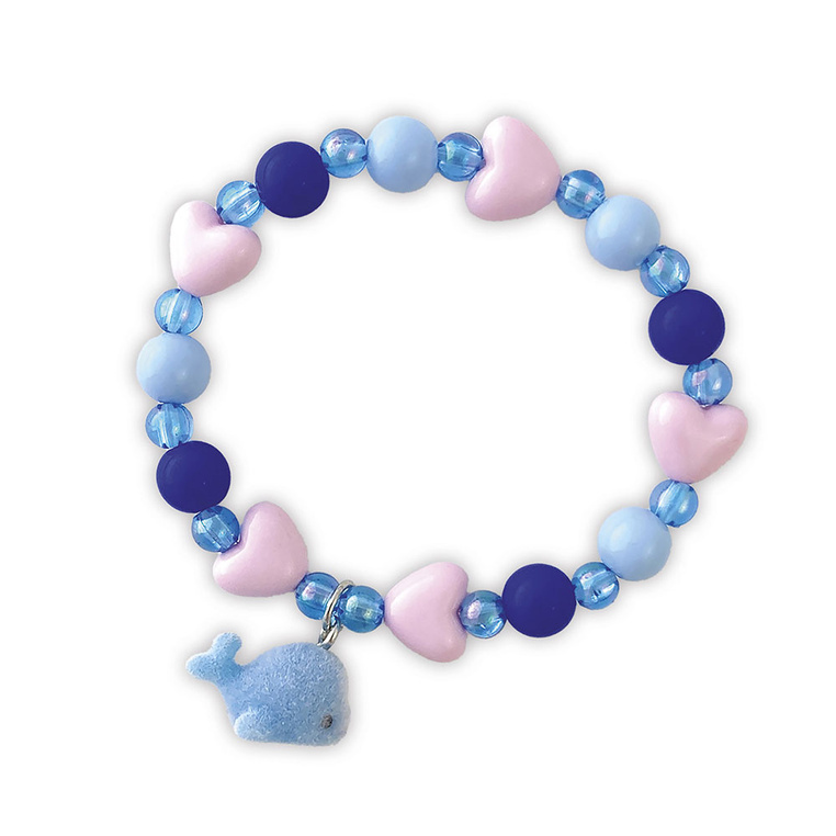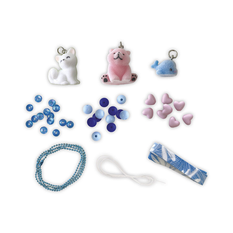 W zestawie znajduje się wszystko, czego potrzeba, by stworzyć piękne i kolorowe dodatki: koraliki w odcieniach niebieskiego, różowe perełki w kształcie serduszek, kulkowy niebieski łańcuszek, gumka jubilerska, wstążka oraz trzy zawieszki przedstawiające wieloryba, niedźwiadka i białego kotka. Dzięki szczegółowej instrukcji nawet początkujący jubiler może w kilka chwil samodzielnie zamienić pomysł w gotową ozdobę.