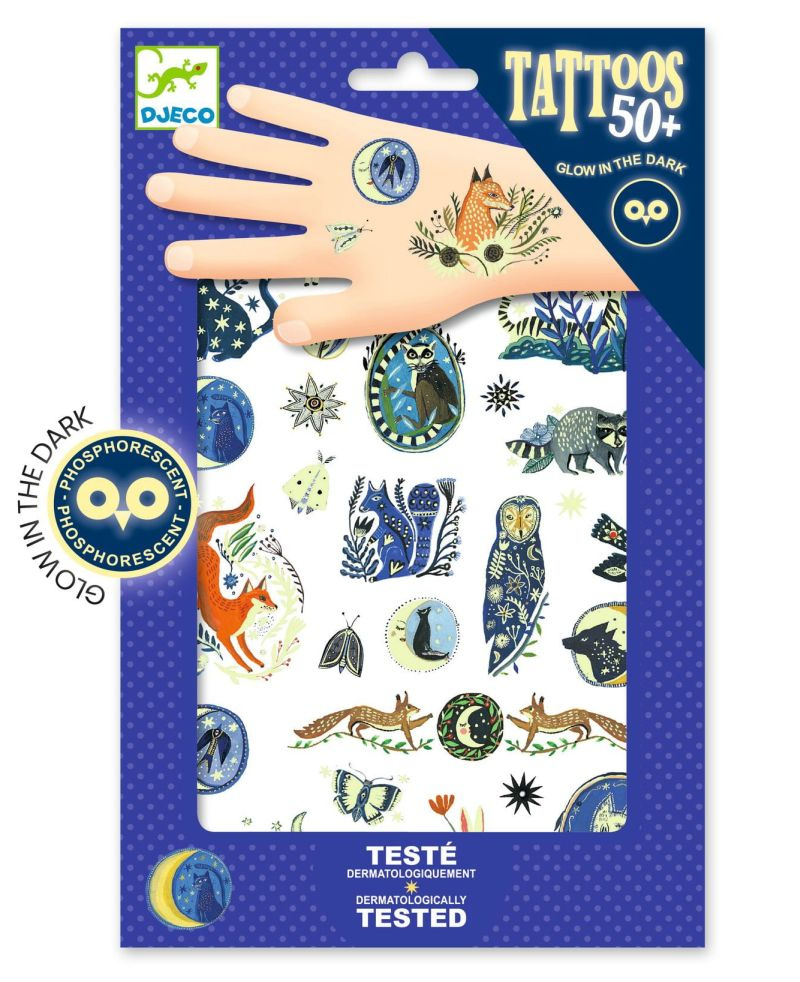 Gdy światła gasną, zaczyna się nocna przygoda w zaczarowanym lesie. Na skórze pojawiają się zwierzęta, które rozświetlają ciemność, a liście i gałązki połyskują jak w świetle księżyca. Tatuaże świecące w ciemności Las nocą Djeco zamieniają dziecięce rączki w magiczne płótna pełne leśnych tajemnic.