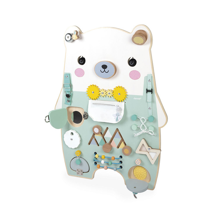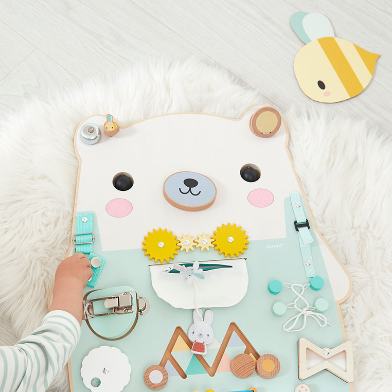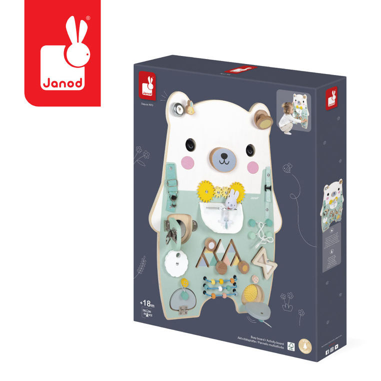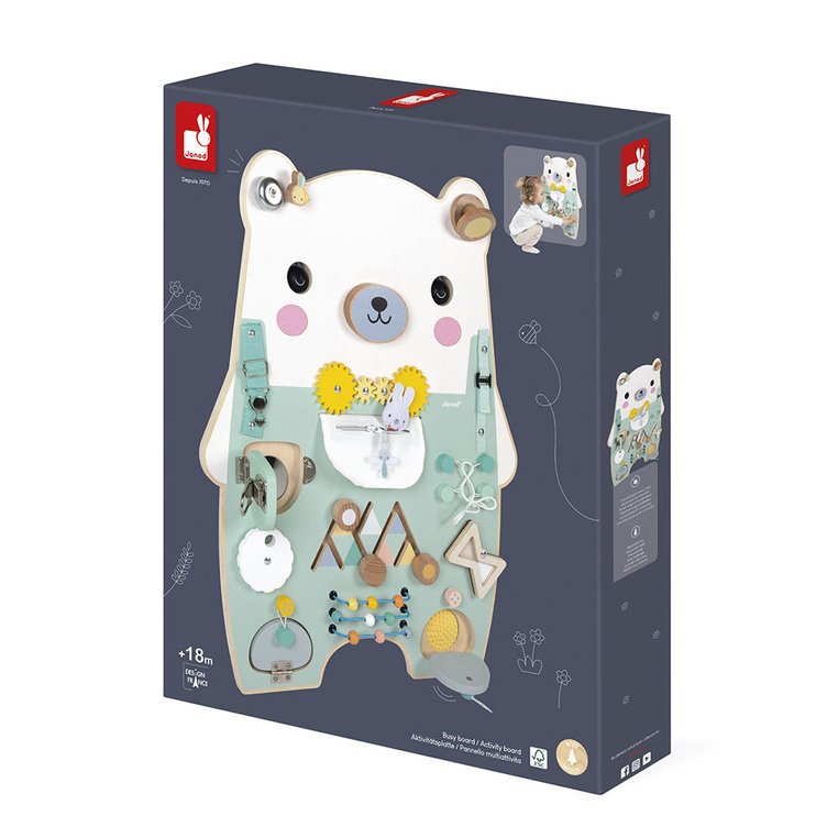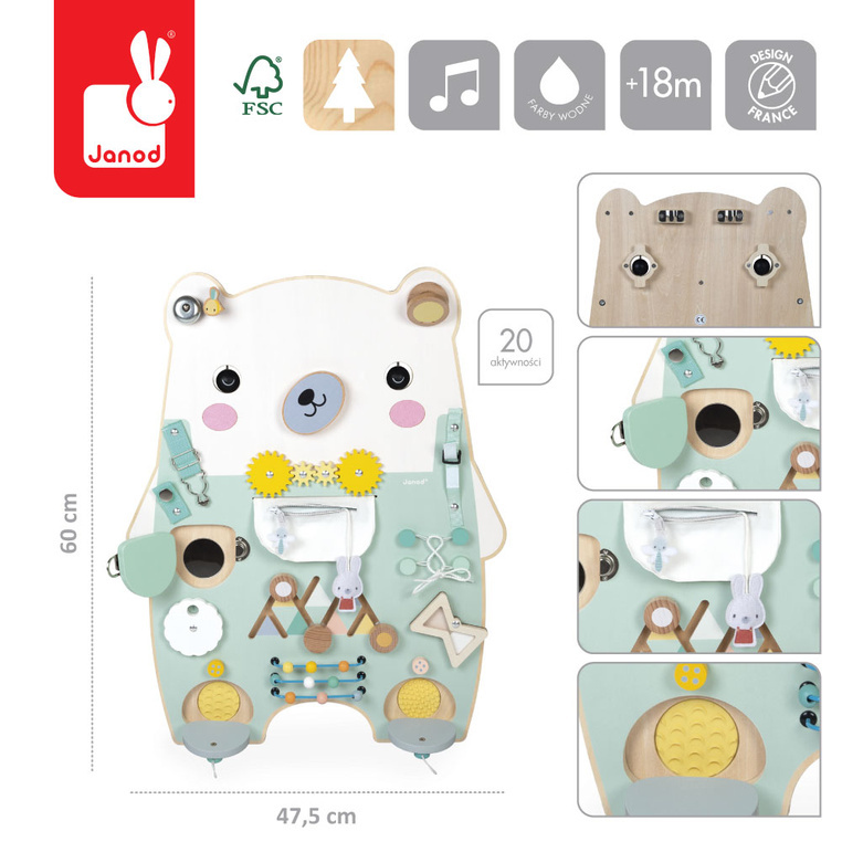 Tablica została zaprojektowana we Francji, a do jej wykonania użyto materiałów najwyższej jakości, takich jak certyfikowane drewno FSC, metal, tkaniny i tworzywo. To nie tylko bezpieczna zabawa, ale też wartościowe wsparcie w codziennym rozwoju umiejętności potrzebnych dziecku w samodzielnym funkcjonowaniu.