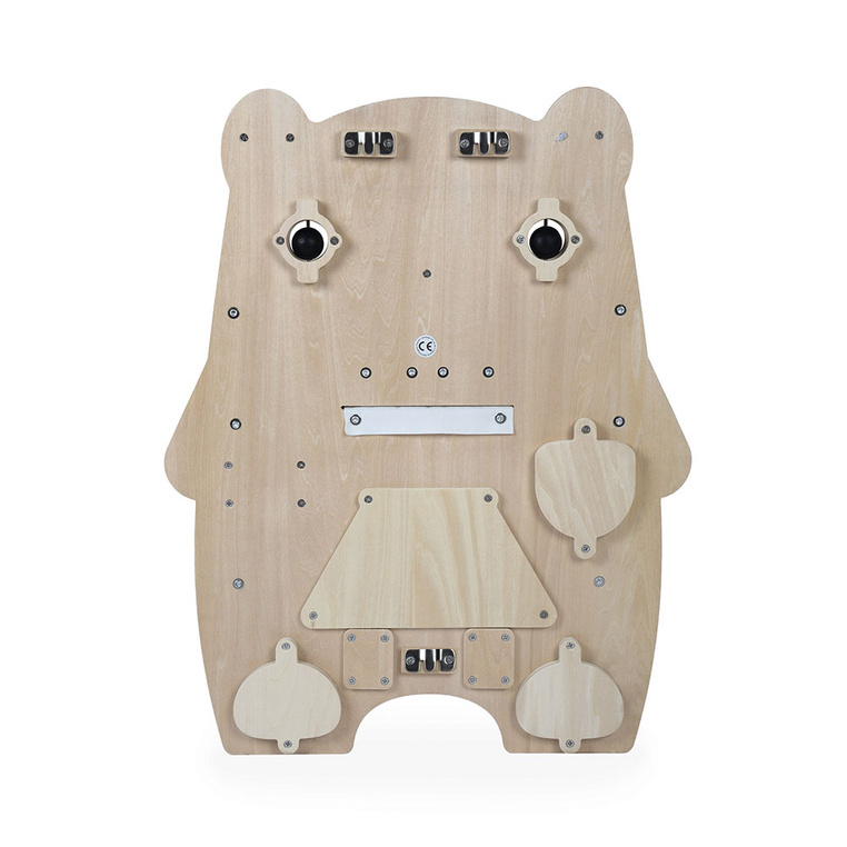 Każdy detal tej tablicy został zaprojektowany z myślą o bezpieczeństwie, funkcjonalności i estetyce. Wśród atrakcji można znaleźć zapięcia, sznureczki do wiązania, kółka zębate, sensoryczne powierzchnie o różnych fakturach, a nawet dzwonek. Wszystko to zachęca do samodzielnych prób, rozwijając małą motorykę, koordynację ręka-oko i logiczne myślenie.