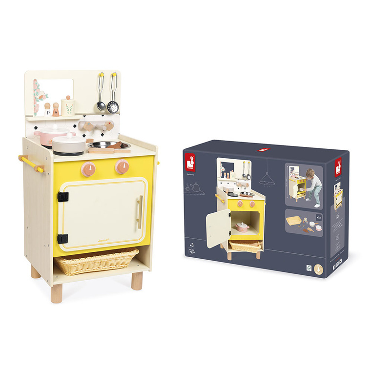 Kuchnia została wykonana z wysokiej jakości drewna z certyfikatem FSC, a jej kompaktowa forma z wieloma funkcjami czyni ją doskonałą zarówno do domowej zabawy, jak i do kącików zabaw w przedszkolach.