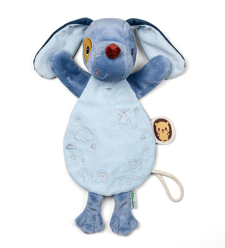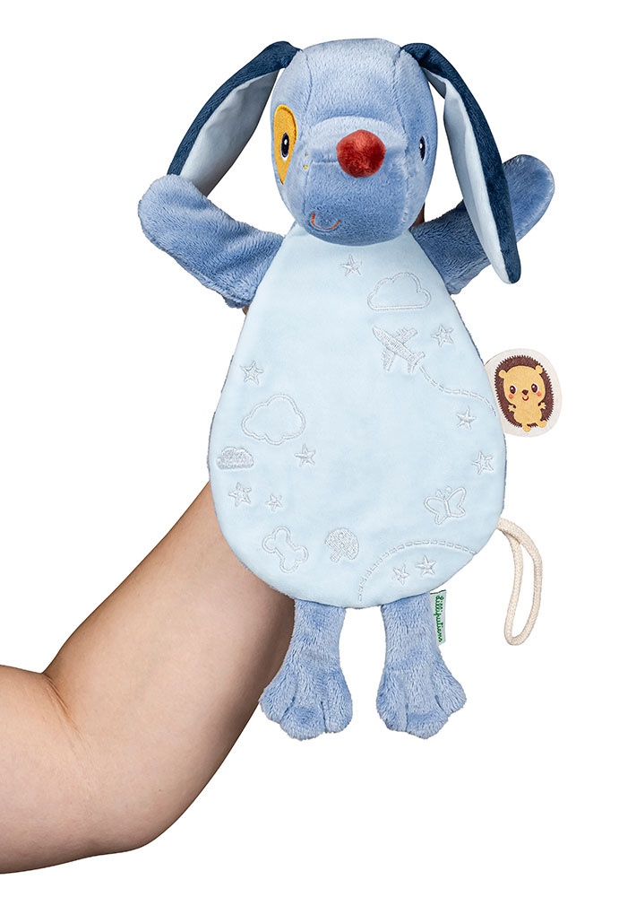 Przytulanka do spania Piesek Jules belgijskiej marki Lilliputiens to pierwszy przyjaciel Twojego maluszka. Miękki, niebieski piesek z długimi uszami został zaprojektowany z myślą o tuleniu, uspokajaniu i wspomaganiu zasypiania niemowląt. Przytulanka pełni funkcję komfortera, a dzięki specjalnemu otworowi w brzuszku może stać się także pacynką, którą dziecko może poruszać i „ożywiać” podczas zabawy.