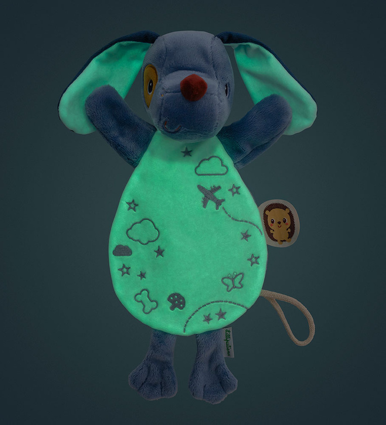 Piesek Jules posiada sznurkową zawieszkę, do której można przymocować smoczek, a jego brzuszek i uszy świecą w ciemności, wspierając rozwój zmysłu wzroku i zapewniając poczucie bezpieczeństwa w nocy. Płaska forma przytulanki sprawia, że łatwo mieści się w łóżeczku, wózku lub torbie dziecięcej, co czyni ją towarzyszem snu i zabawy w domu oraz w podróży.