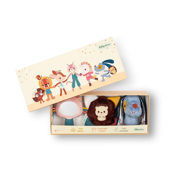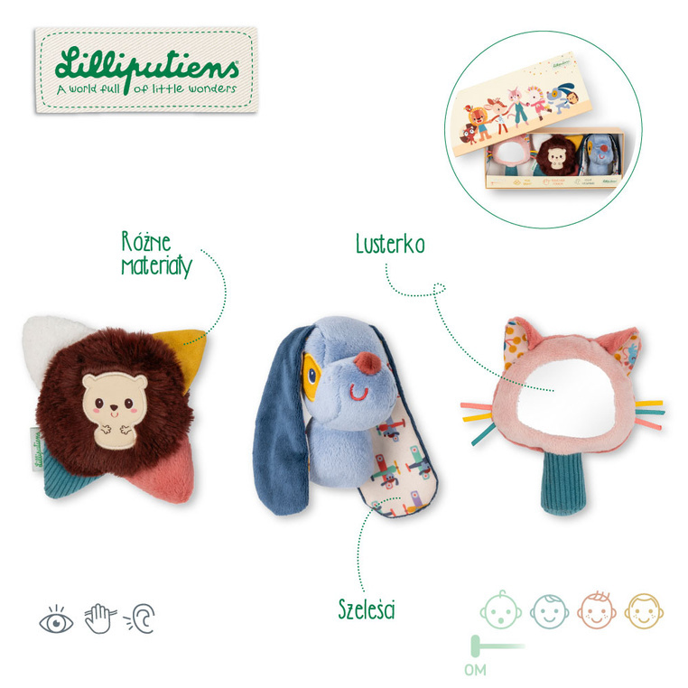Zestaw można dowolnie rozszerzać o inne produkty z tej samej kolekcji, tworząc spójną serię edukacyjnych zabawek. Miękkie zabawki sensoryczne Lilliputiens nadają się na prezent – są zapakowane w estetyczne pudełko i łatwe w utrzymaniu czystości (można prać w pralce w 30ºC w delikatnym cyklu).