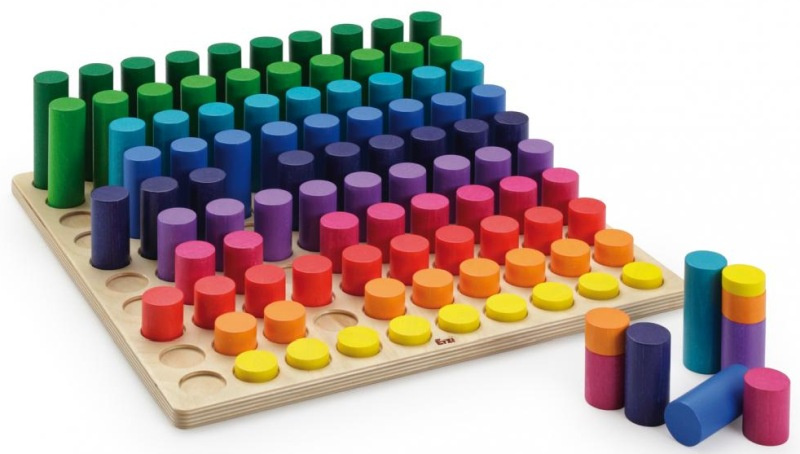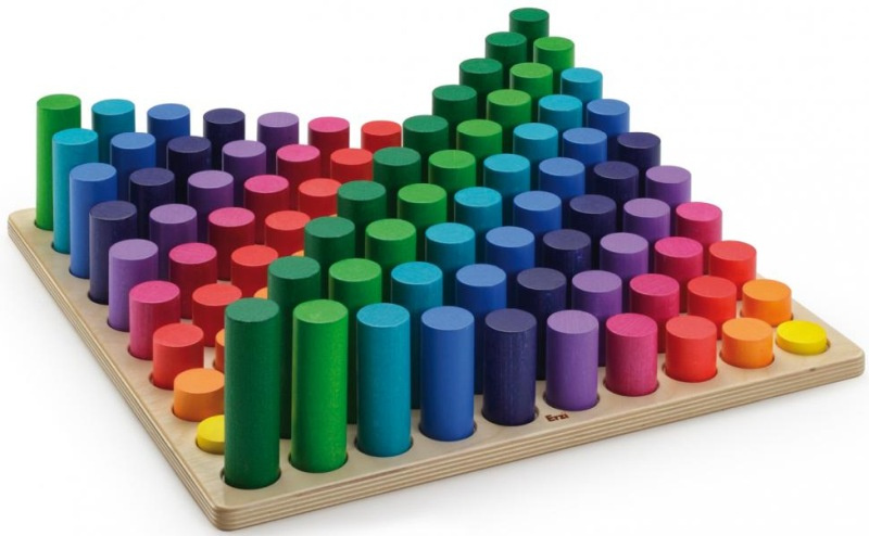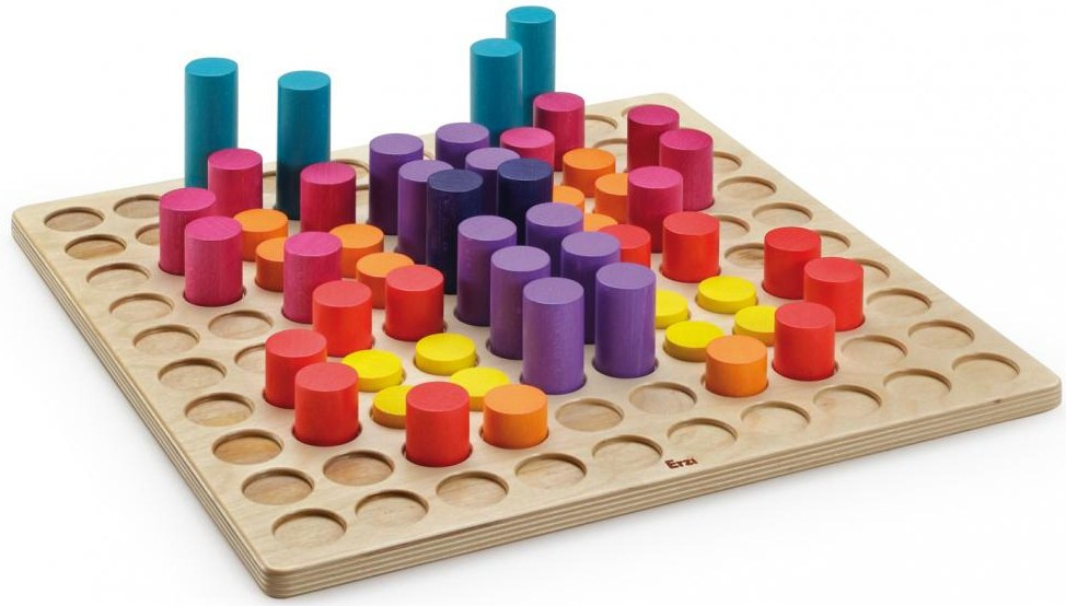 Drewniana gra edukacyjna dla dzieci w wieku 5+ oparta na zasadach teorii mnogości. Zestaw zawiera 100 kolorowych cylindrów (Ø36 mm) o wysokości od 10 do 100 mm oraz perforowaną tablicę umożliwiającą tworzenie różnorodnych układów. Każda wysokość ma przypisany inny kolor, co wspomaga rozpoznawanie wzorców, sortowanie, klasyfikację i naukę sekwencji liczbowych od 1 do 10.