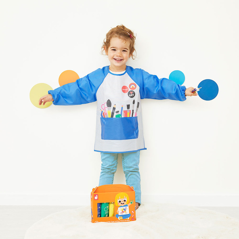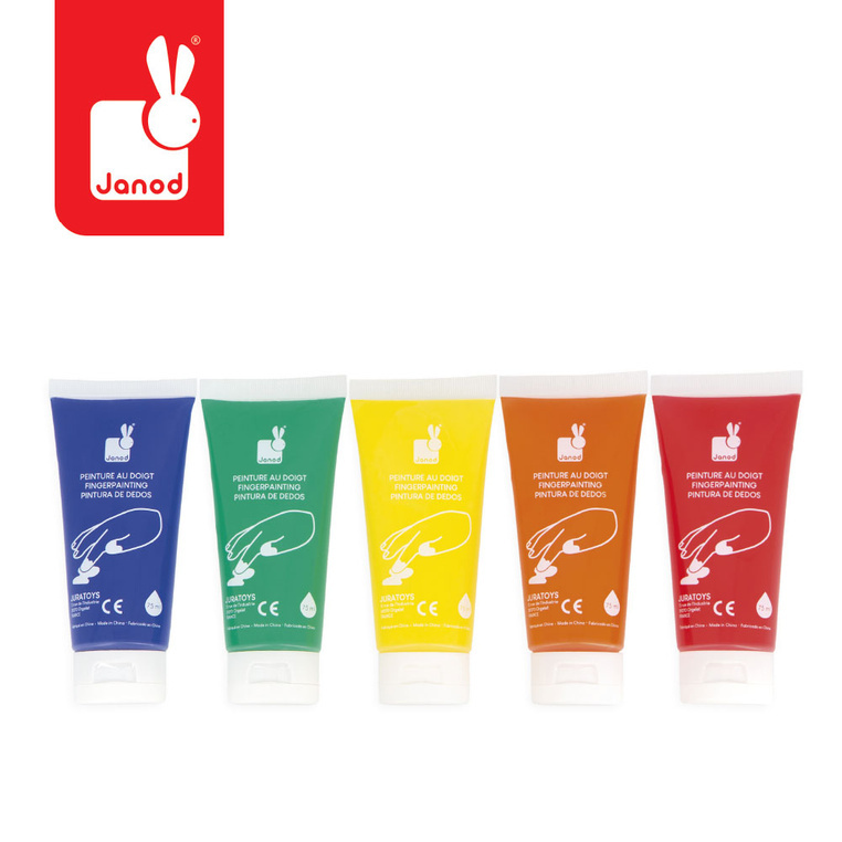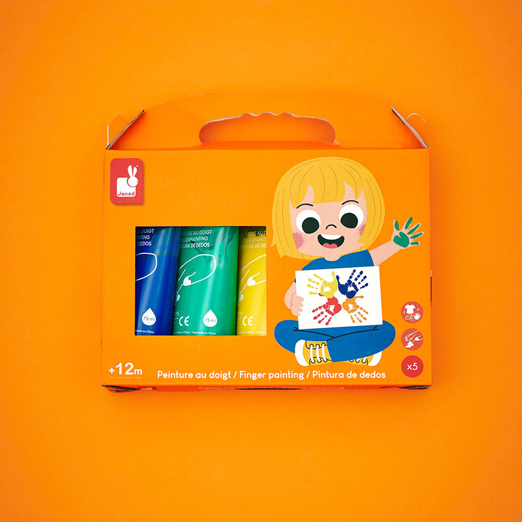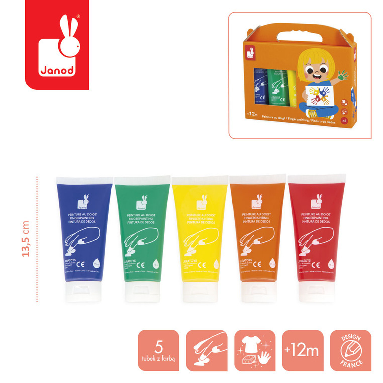 5 farbek, które przenoszą małych artystów do świata żywych barw, sprzyjającego tworzeniu pierwszych dzieł sztuki. Farbki do malowania rękami Janod to 5 intensywnych odcieni, które zamknięto w ergonomicznych tubkach, wygodnych nawet dla drobnych rączek i całkowicie bezpiecznych dla delikatnej skóry. Po skończonej zabawie pigment zmywa się bez trudu, dzięki czemu stolik wraca do porządku, a mali twórcy mogą natychmiast zacząć kolejny obraz. Całość znajduje się w estetycznym kartonowym pudełku ozdobionym przyjazną grafiką, które samo w sobie zachęca do podarowania zestawu w prezencie. Produkt zaprojektowano we Francji w ramach kolekcji COLO, rekomendowanej już od pierwszego roku życia. Podczas malowania dzieci rozwijają precyzję ruchów, ćwiczą małą motorykę, uczą się łączenia barw i odkrywają radość ekspresji.