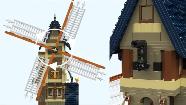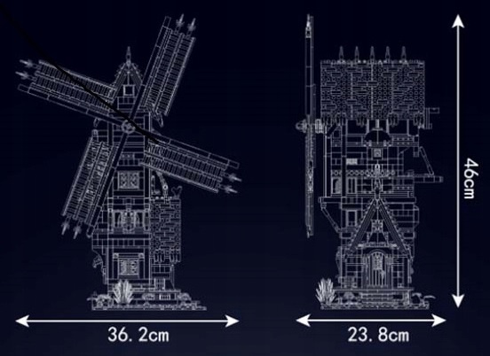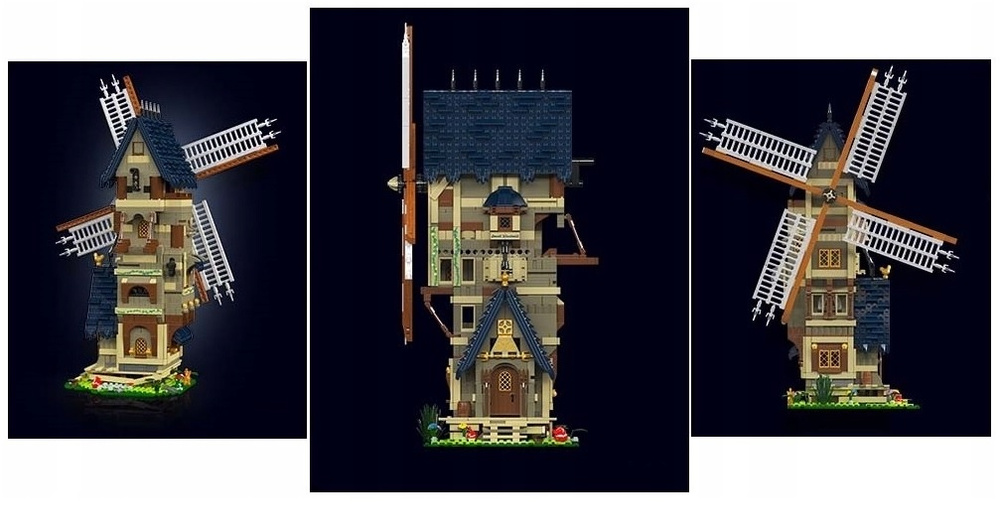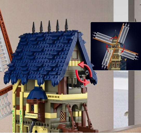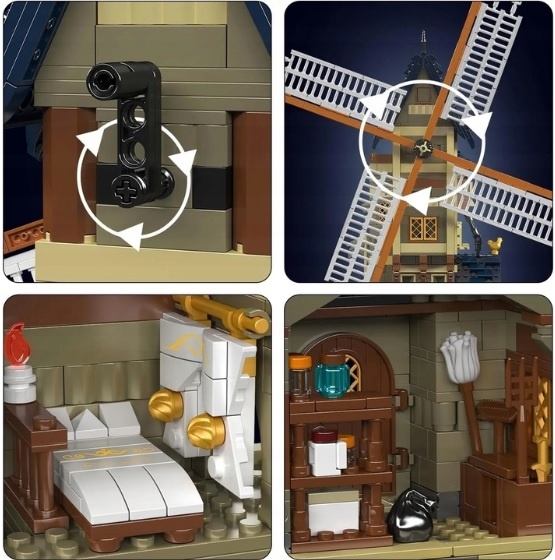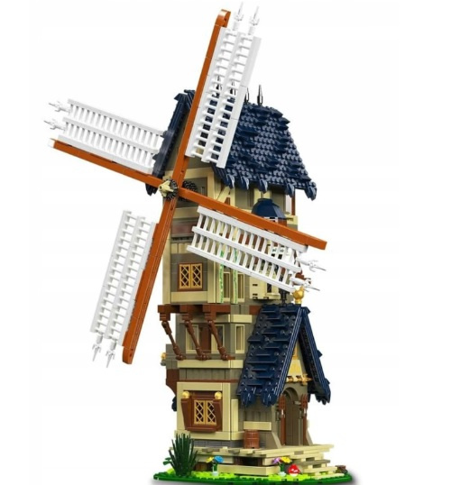 Zestaw zawiera 1584 starannie wykonanych elementów, dzięki którym zbudujesz imponujący, wielowarstwowy wiatrak o wysokości aż 36 cm. Charakterystyczny niebieski dach, białe, ruchome łopaty oraz drewniane balkony i kamienna elewacja sprawiają, że model prezentuje się niezwykle realistycznie. Konstrukcja została wzbogacona o detale roślinne, miniaturowe doniczki i urocze elementy scenerii, które nadają całości niepowtarzalnego klimatu.