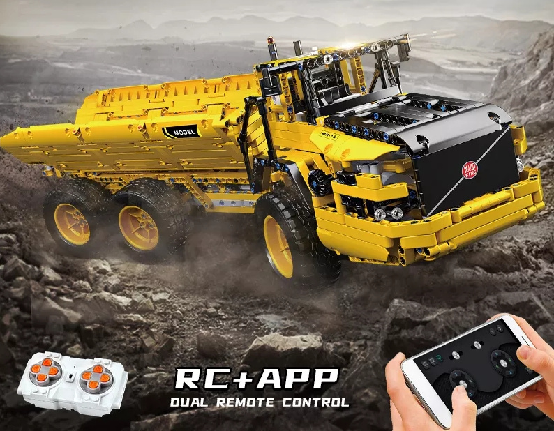 - Zdalne sterowanie 2.4GHz + Bluetooth – płynna jazda do przodu/tyłu, skręcanie, sterowanie wysypem i podnoszeniem ładowni.