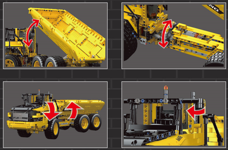 - Przegubowe nadwozie – niezależna praca przodu i tyłu pojazdu, realistyczne odwzorowanie prawdziwych maszyn budowlanych.