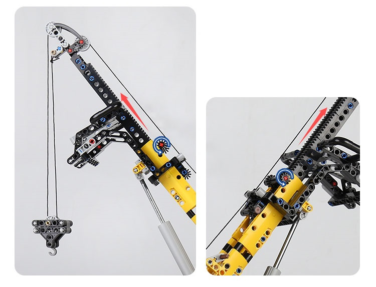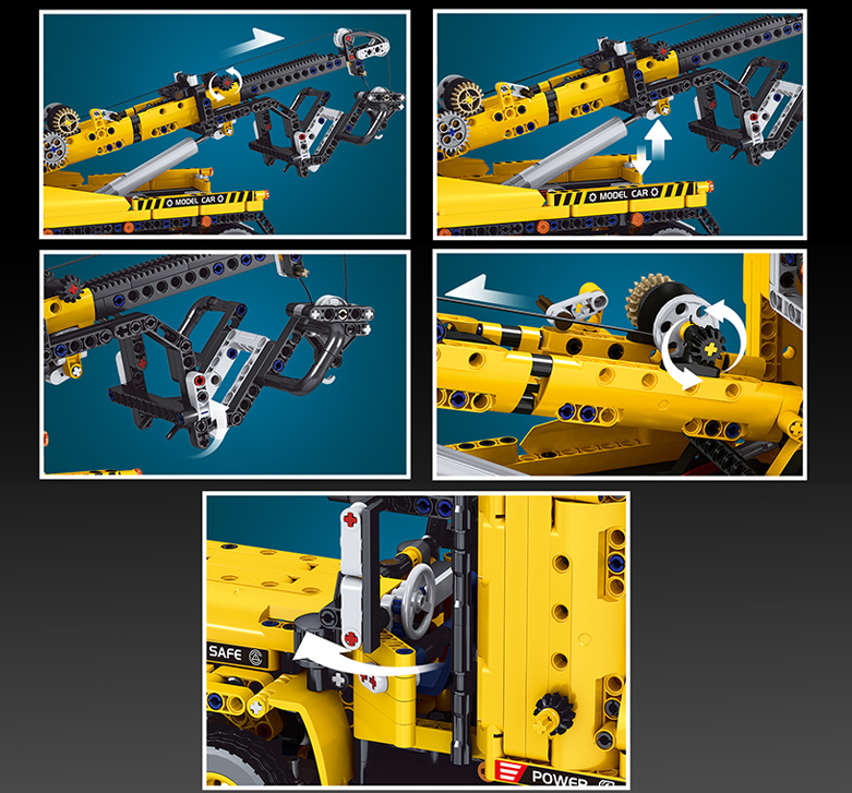 • Wysuwany i chowany hak – funkcjonalny mechanizm holowniczy do podnoszenia i zabezpieczania innych pojazdów z klocków.