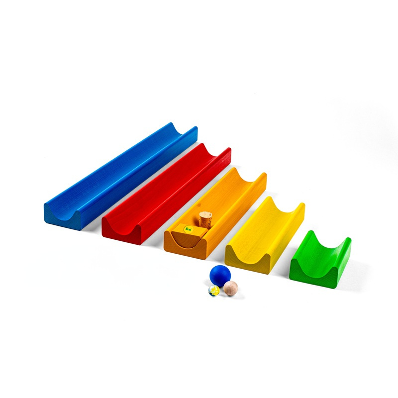 - 5 torów (długości: 1x 500 mm, 1x 400 mm, 1x 300 mm, 1x 200 mm, 1x 100 mm), 1 tama, 1 korek, 3 kulki (szkło, drewno).