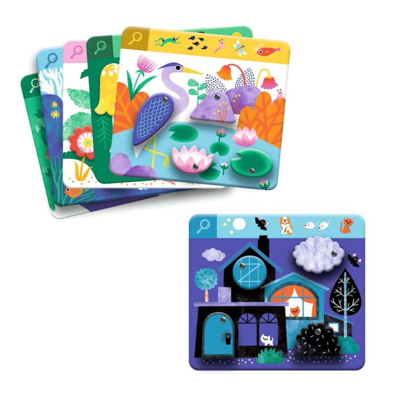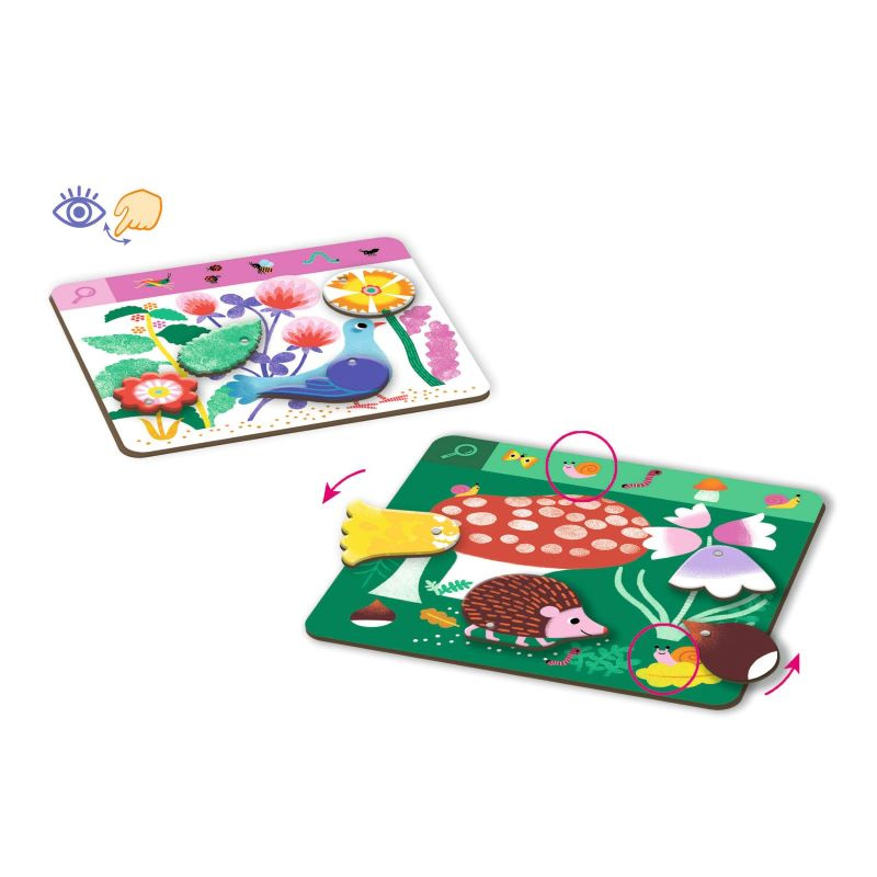 Każda z sześciu plansz kryje ruchome elementy, które można obracać i przesuwać. Dzięki temu maluchy nie tylko świetnie się bawią, ale również ćwiczą zręczność, koordynację ręka–oko oraz precyzję ruchów. Odkrywanie ukrytych obrazków rozwija spostrzegawczość, umiejętność kojarzenia szczegółów, a także pomaga w nauce rozróżniania kolorów i kształtów.