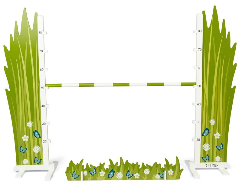 Drewniana przeszkoda, ozdobiona motywem kwiecistej łąki, została zaprojektowana tak, by rosnąć razem z dzieckiem. Regulowany drążek można ustawić na jednej z 6 wysokości (od 20 do 80 cm). Co ważne, uchwyty zostały skonstruowane w taki sposób, by drążek wypadał przy uderzeniu, zapewniając większe bezpieczeństwo podczas skoków.