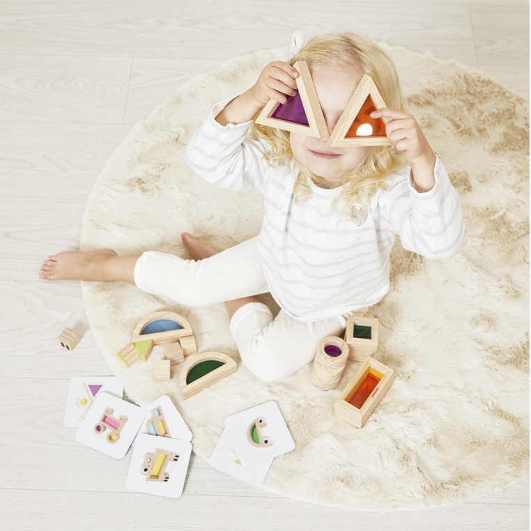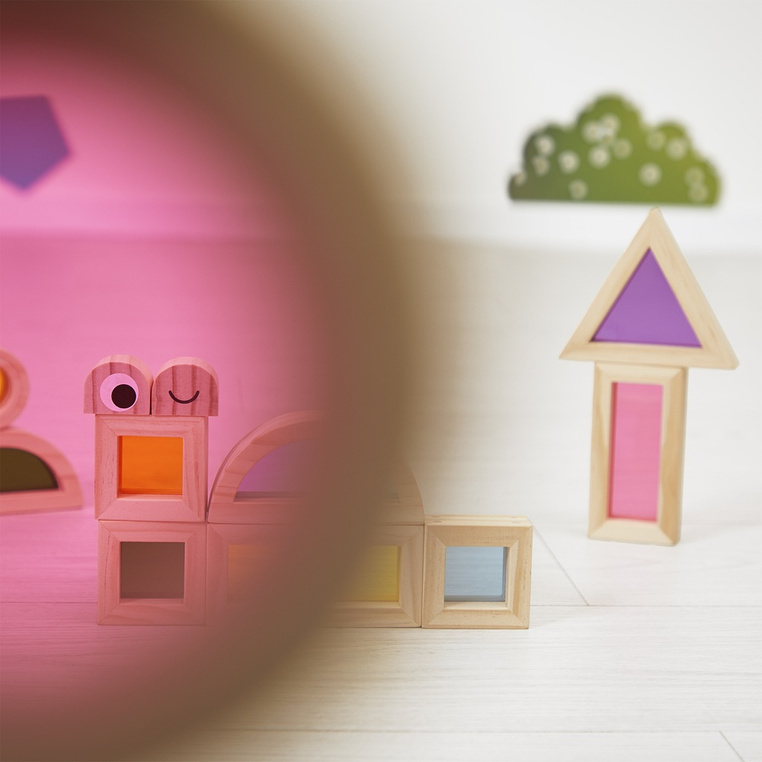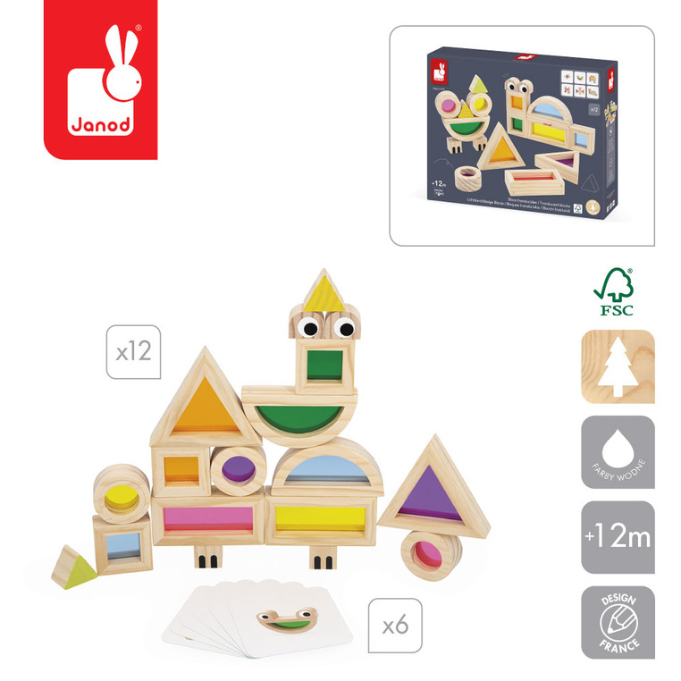 Klocki drewniane przeźroczyste kolorowe sensoryczne Janod to 12 geometrycznych elementów w jasnych ramkach, wypełnionych bezpiecznymi, nietłukącymi się „szybkami”, które przepuszczają światło i mienią się w jego promieniach. W zestawie znajdują się też dodatkowe 6 mniejszych elementów: 2 trójkąty, 2 oczka oraz 2 sześciany-łapki, które pobudzają wyobraźnię i zachęcają do kreatywnego eksperymentowania.