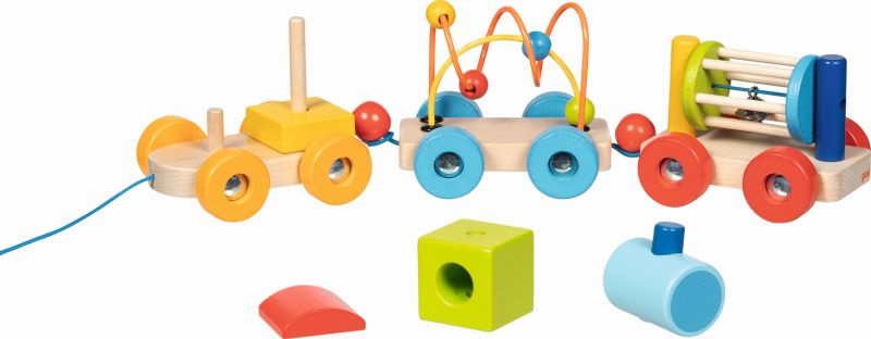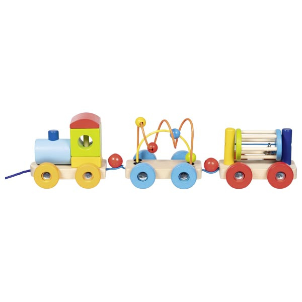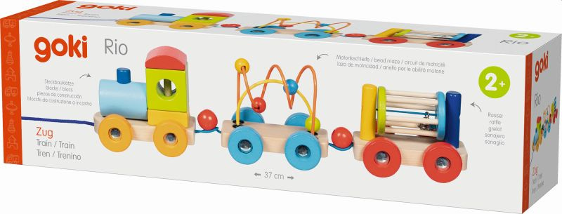 Drewniana zabawka do ciągnięcia Pociąg Rio z klockami labirynt z koralików grzechotka Goki to 4 zabawki w jednej: