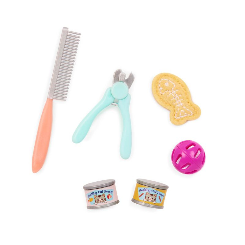 - Kompletny zestaw dla kociary - oprócz lalki i kotka w zestawie znajdują się także: ozdobna obroża z kokardką, dwie puszki karmy, piłeczka do zabawy, zabawkowa rybka oraz akcesoria pielęgnacyjne, takie jak grzebień i cążki do pazurków.