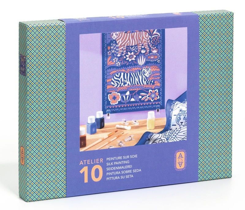 Atelier Grands Augustins (AGA) to wyjątkowa kolekcja zestawów artystycznych dla dorosłych marki Djeco, która pozwala odkrywać różnorodne techniki plastyczne, rozwijać kreatywność i doświadczać przyjemności płynącej z tworzenia. Zestaw Atelier 10 – Tygrysy na jedwabiu wprowadza w fascynującą technikę malowania na jedwabiu, umożliwiając samodzielne ozdobienie materiałowej apaszki w efektowne wzory w odcieniach fioletu i pomarańczu.