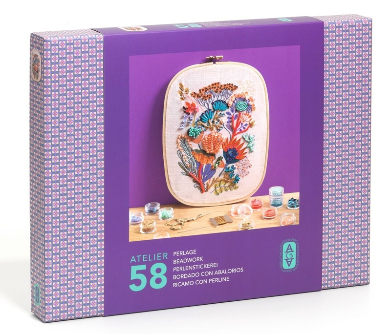 Kolekcja Atelier Grands Augustins (AGA) marki Djeco to wyjątkowa linia zestawów artystycznych dla dorosłych, stworzona z myślą o osobach, które pragną rozwijać swoje pasje twórcze, wyciszyć się i odkrywać nowe techniki rękodzieła. Zestaw Atelier 58 prezentuje niezwykle elegancką i relaksującą technikę haftu koralikowego, pozwalając samodzielnie wykonać subtelny, kwiatowy obraz na płótnie rozpiętym w drewnianym tamborku.