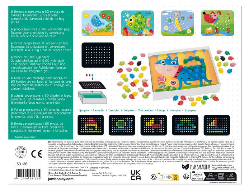 Dziecko może korzystać z 6 plansz o różnym stopniu trudności i aż 60 kolorowych, drewnianych kołeczków. Każda plansza to nowa historia i inny poziom wyzwania. Kiedy wszystkie obrazki zostaną wypełnione, na czarnej planszy można tworzyć własne, niepowtarzalne projekty.