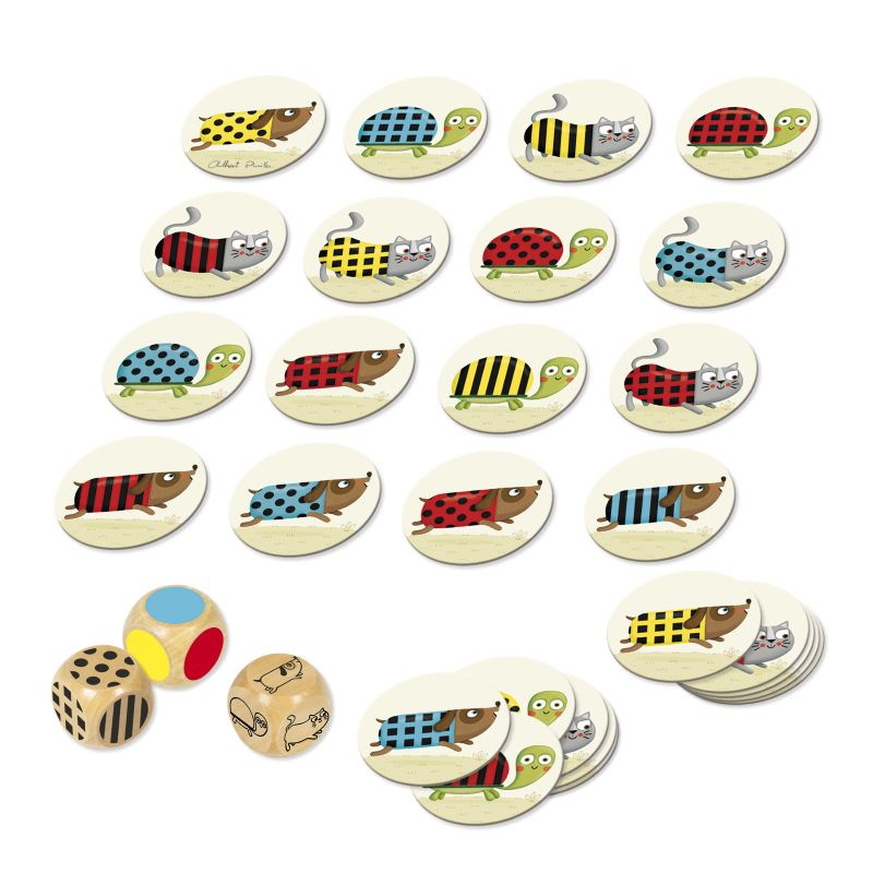 Zasady są proste, ale emocje gwarantowane. Dziecko rzuca trzema kostkami i w mgnieniu oka musi odnaleźć żeton ze zwierzątkiem, kolorem i tłem wskazanym przez kości. Liczy się refleks, spostrzegawczość i dobra zabawa. Wygrywa ten, kto zbierze najwięcej płytek. Co ważne, młodsze dzieci mogą zacząć od prostszej wersji z dwiema kostkami, dzięki czemu gra doskonale dopasowuje się do wieku i możliwości malucha.
