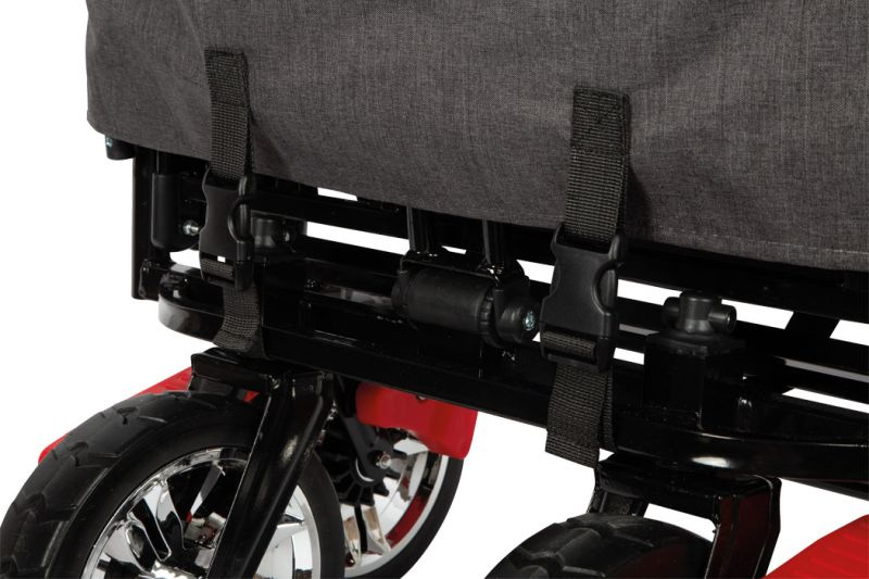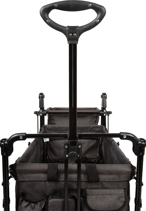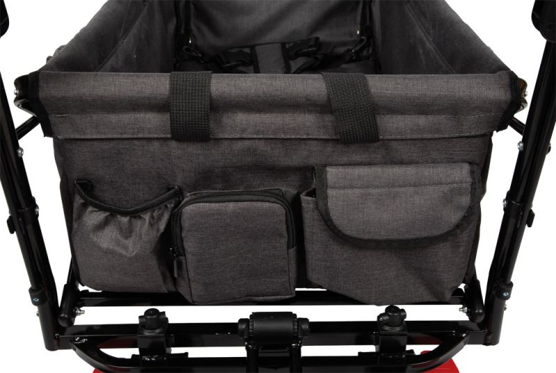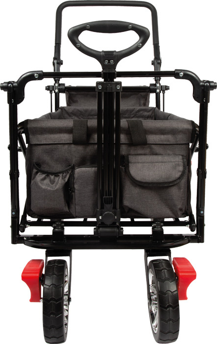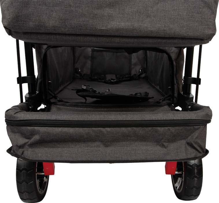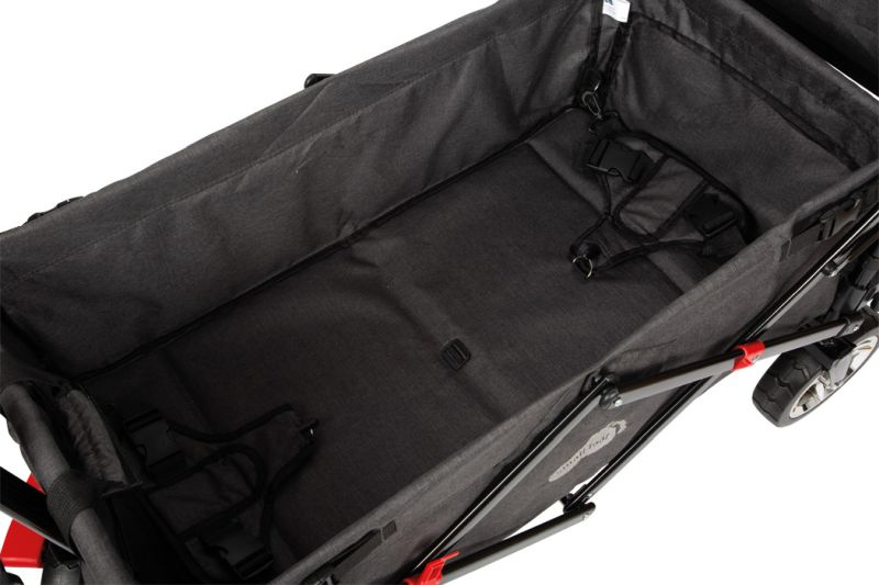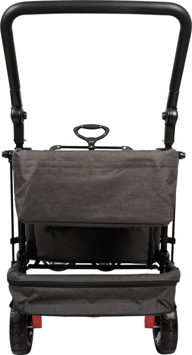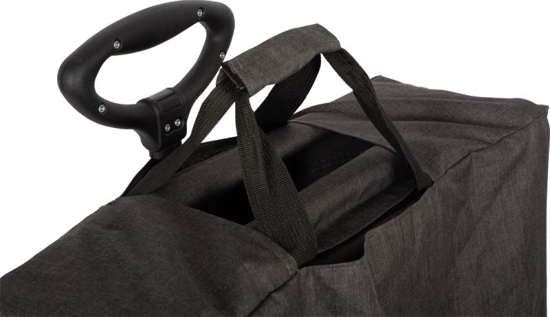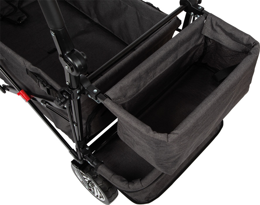 Wózek ma przemyślane detale: boczne kieszenie, dodatkowy schowek na drobiazgi i prowiant, a nawet boczne wejście, które świetnie sprawdza się przy przewozie psa lub dłuższych przedmiotów. Dzięki dwóm uchwytom można go zarówno ciągnąć, jak i pchać, a regulowany uchwyt dopasowuje się do wzrostu użytkownika. Po skończonej wycieczce wszystko złożysz w kilka sekund i schowasz do pokrowca.