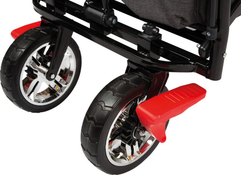 - Stabilne, szerokie koła z hamulcami i chromowanymi felgami