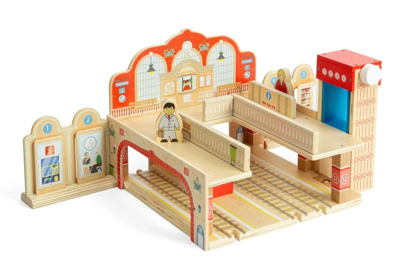 Ten drewniany dodatek do kolejki to tętniący życiem punkt przesiadkowy, który oferuje mnóstwo możliwości zabawy w odgrywanie ról, kluczowej dla rozwoju społecznego i językowego. Na podwójnym peronie jest miejsce dla dwóch torów, co pozwala na jednoczesną obsługę pociągów pospiesznych i osobowych. Co najlepsze, stacja ma w pełni działającą, ręcznie sterowaną windę, którą figurki pasażerów mogą wjechać na górne piętro, prosto do eleganckiego holu biletowego. To idealny prezent dla 3 latka i znakomita zabawka do przedszkola, która uczy planowania i organizacji.