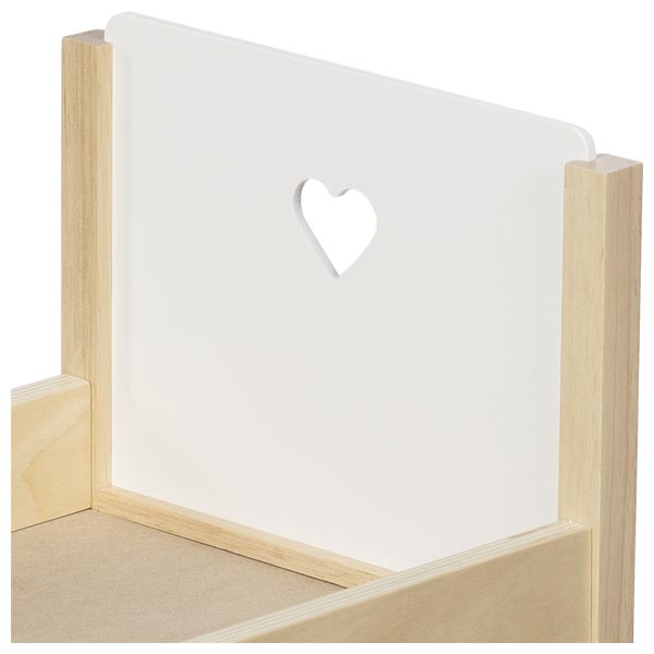 Wykonane z wysokiej jakości drewna, łóżeczko jest trwałe i bezpieczne dla dzieci. Jego klasyczny kształt oraz charakterystyczne wycięcie w kształcie serca dodają uroku i sprawiają, że łóżko pięknie prezentuje się w dziecięcym pokoju.