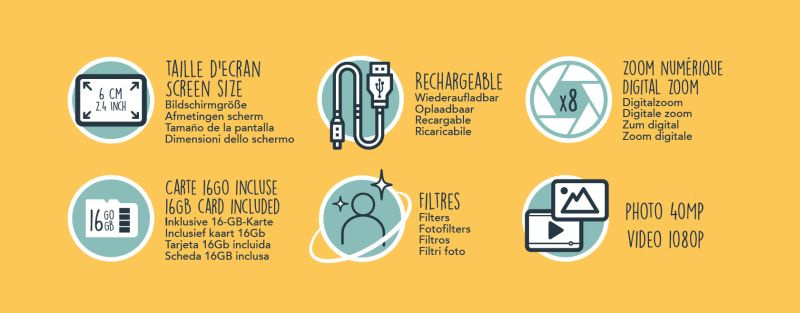 Zdjęcia w jakości 40 megapikseli, filmy w Full HD 1080p i zoom cyfrowy 8x sprawiają, że każda fotografia i filmik wygląda imponująco. Kolorowy ekran o przekątnej 6 cm pozwala wygodnie przeglądać zdjęcia, a różnorodne filtry foto i wideo dodają im charakteru. Aparat jest lekki jak piórko (80 g), więc dziecko może go mieć zawsze przy sobie.