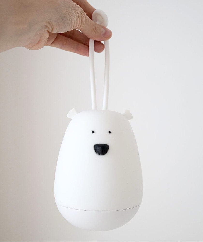Dzięki wygodnemu zapięciu możesz zawiesić lampkę przy łóżeczku, nad przewijakiem, a także zabrać w podróż. Miś świeci aż w 7 kolorach, a jego mięciutka, silikonowa powłoka jest całkowicie bezpieczna dla najmłodszych: wolna od BPA, nie nagrzewa się i jest łatwa do czyszczenia. Po ściśnięciu, lampka zmienia kształt, by po kilku chwilach wrócić do pierwotnego kształtu. Maluszek może sterować światłem poprzez delikatne poklepywanie, a rodzice mają również do dyspozycji wielofunkcyjny pilot, który pozwala na zmianę trybów świecenia i ustawienie automatycznego wyłączenia po 2 godzinach. Jeśli lampka ma towarzyszyć dziecku przez całą noc, wystarczy jedno kliknięcie, by świeciła nieprzerwanie do rana.