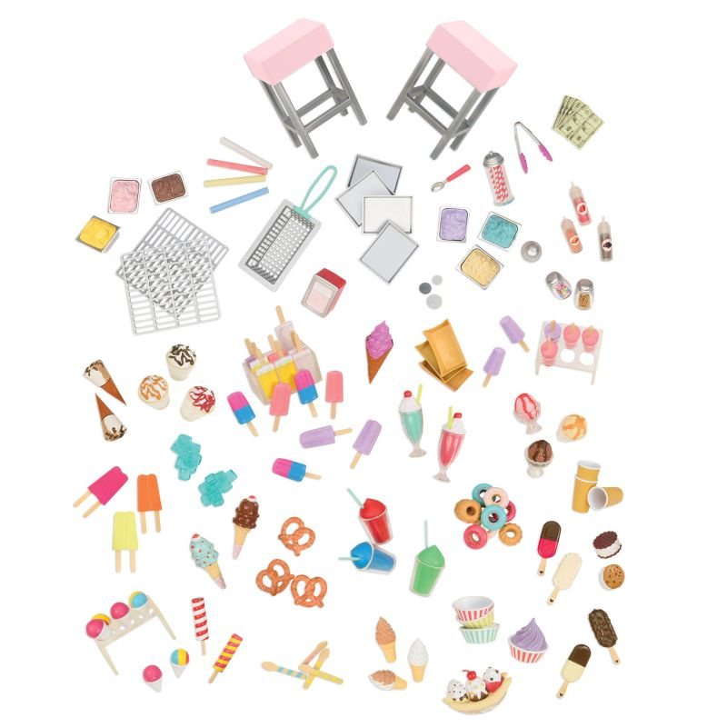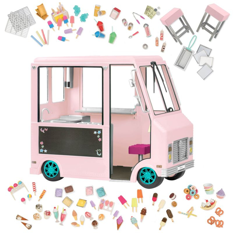 Zestaw Sweet Stop Ice Cream Truck Our Generation to prawdziwy hit wśród zabawek dla lalek 46 cm. Wnętrze pojazdu kryje półki z lodami, napojami i słodkimi dodatkami, a dzieci mogą wcielać się w rolę sprzedawcy i klientów.