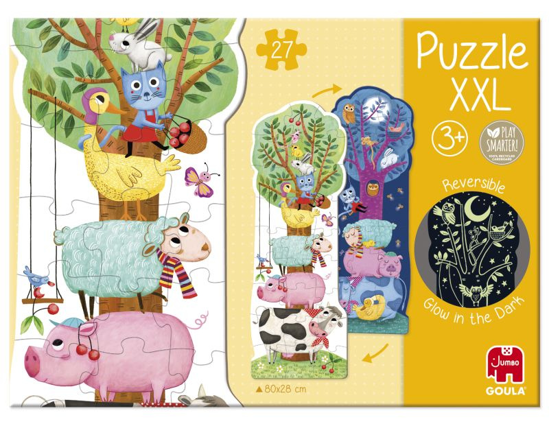 Czas na dzień pełen przygód i spokojną noc na farmie. Podczas układania puzzli dzieci odkrywają, jak zmienia się świat zwierząt, gdy słońce chowa się za horyzontem. Krówki, świnki i owce szykują się do snu, a wśród gałęzi drzewa cichutko przysiadają sowy. Puzzle dla dzieci XXL Farma Dzień i Noc Świecące w ciemności Goula to pięknie ilustrowana, dwustronna układanka, która zachwyca kolorami i pomysłowością.