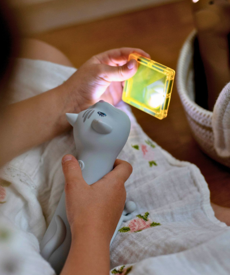 Latarka Mimi została stworzona, by inspirować do kreatywności. Jej światło doskonale sprawdzi się jako reflektor w teatrze cieni, subtelna lampka do czytania w namiocie z koca lub po prostu jako łagodne oświetlenie pomagające zasnąć. Co istotne dla wygody i zdrowia oczu, latarka oferuje poręczną regulację jasności. Dzięki temu możecie płynnie dostosować intensywność blasku do konkretnej sytuacji, od intensywnej zabawy do delikatnego czuwania. Nie muszą Państwo martwić się o częste ładowanie; ten koci przyjaciel zapewnia wyjątkowo długi czas pracy, od 12 aż do 90 godzin, a zasilanie uzupełnia się wygodnie i nowocześnie przez kabel USB-C. Dzięki praktycznej zawieszce, latarka kotek Mimi może łatwo zawisnąć na wezgłowiu łóżka lub na gałce drzwi, by zawsze czuwać blisko malucha.