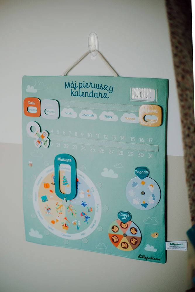 Kalendarz Lilliputiens wyposażony jest w obrotowe tarcze i elementy na rzepy, które umożliwiają dziecku oznaczenie aktualnej daty, wybór dnia tygodnia, wskazanie miesiąca i roku, a także dopasowanie pogody oraz określenie własnego nastroju. Zabawa staje się przyjemnym sposobem na rozwój codziennych nawyków i wprowadzenie małego obserwatora w świat zmian jakie zachodzą każdego dnia. Tablicę zdobią charakterystyczne postacie Lilliputiens takie jak piesek Jules lecący samolotem, jeżyk Leon oraz pełne humoru myszki dzięki czemu produkt budzi pozytywne emocje i zachęca do codziennego korzystania.