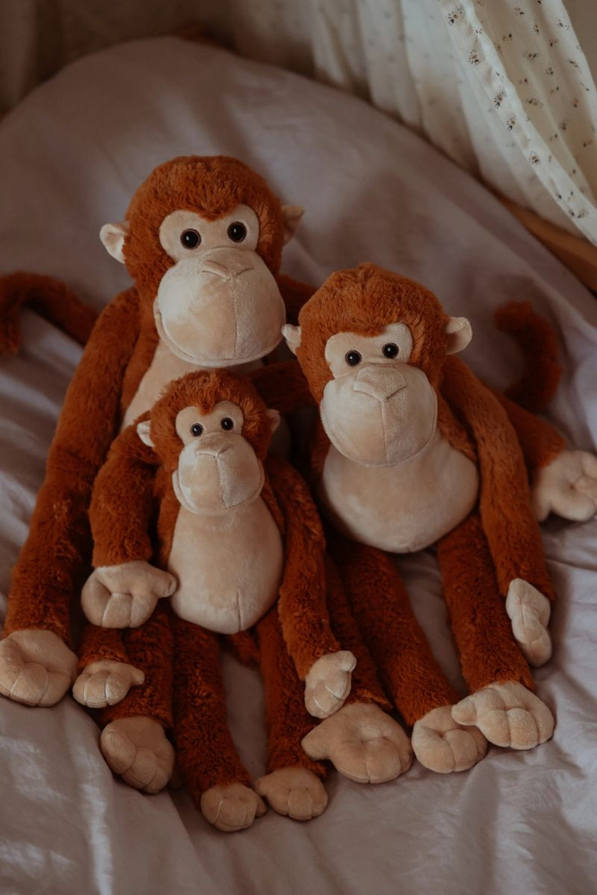 Naturalny ciężar 1,8 kg sprawia, że pluszak obciążeniowy delikatnie otula ciało, pomagając wyciszyć emocje i uspokoić napięcie. Maskotki obciążeniowe są cenione za swoje właściwości sensoryczne, ponieważ równomierny nacisk wspiera koncentrację, zmniejsza niepokój i buduje poczucie bezpieczeństwa. Długa forma ramion i nóg pozwala łatwo objąć małpkę, ułożyć ją na kolanach lub przytulić w trakcie odpoczynku.