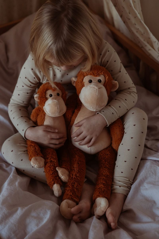 Waga pluszaka została dobrana z myślą o bezpieczeństwie. Zaleca się, aby ciężar nie przekraczał 10% masy ciała dziecka. Dzięki temu małpka może być swobodnie trzymana, noszona i przytulana, bez ryzyka nadmiernego obciążenia. Kompaktowy rozmiar korpusu ułatwia codzienne użytkowanie w domu, podczas odpoczynku lub spokojnych aktywności.