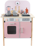 Drewniana kuchnia dla dzieci z naczyniami i zegarem różowy kolor światło dźwięk
