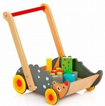 Drewniany wózek do pchania z kolorowymi klockami, Jeż Jurek, zabawki drewniane