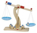 Drewniana waga z niebieskimi szalkami, goki
